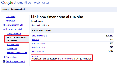 Dalla sezione “Link che rimandano al tuo sito” di Webmaster Tools, quindi, sarà possibile selezionare la voce “Siti di riferimento” per collegarsi al relativo profilo dello stesso sito su Google Analytics.