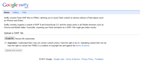 Da poco è stato annunciato e reso disponibile online Swiffy, un’applicazione che consente di convertire i file .swf di flash in pagine HTML5 utilizzando in modo massiccio SVG e quindi renderizzabili solamente nei Browser più avanzati come Chrome e Safari.