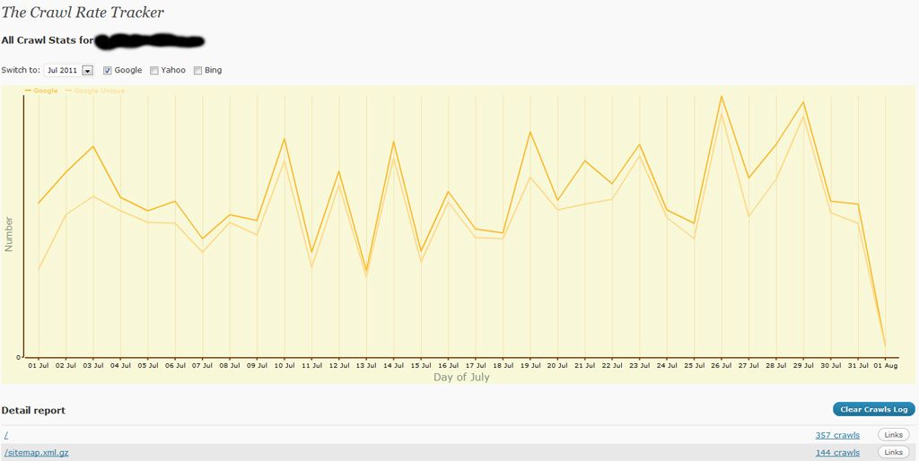 Crawl Rate Tracker permette quindi di tracciare le visite che giungono al nostro sito da Google e da altri motori di ricerca, inserendo tutto all’interno di un funzionale grafico.